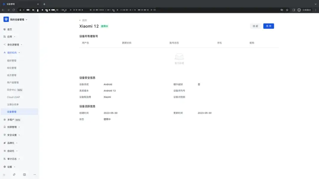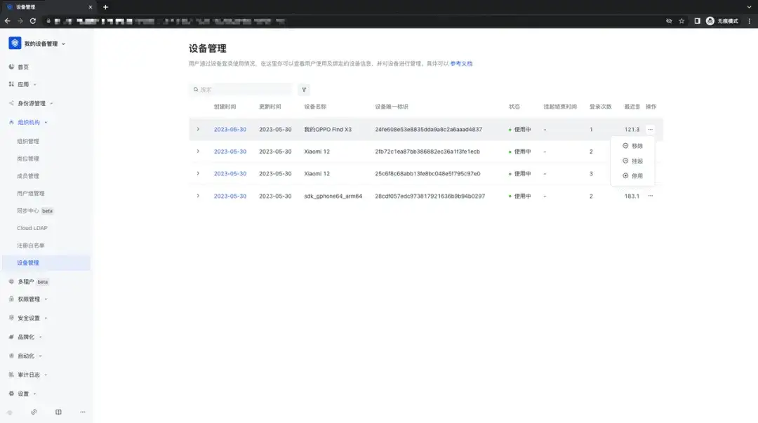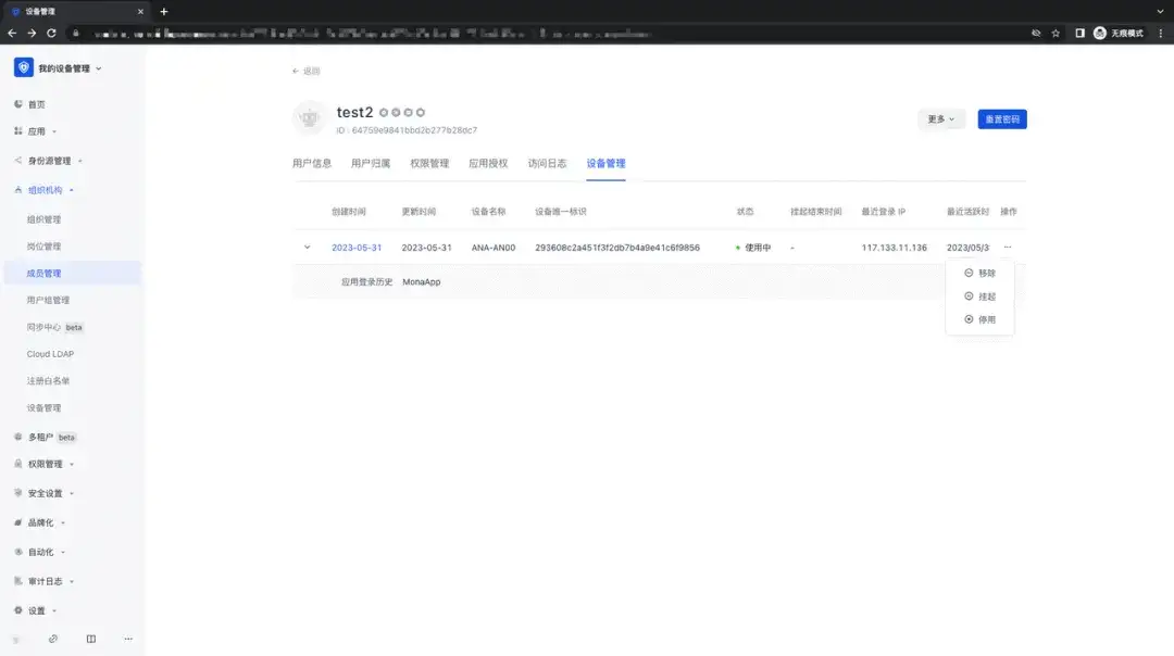 点击「组织机构」-「成员管理」-「成员详情」页面,用户可以看到使用该账户登录的所有设备信息,并且可以进行移除、挂起、停用操作;