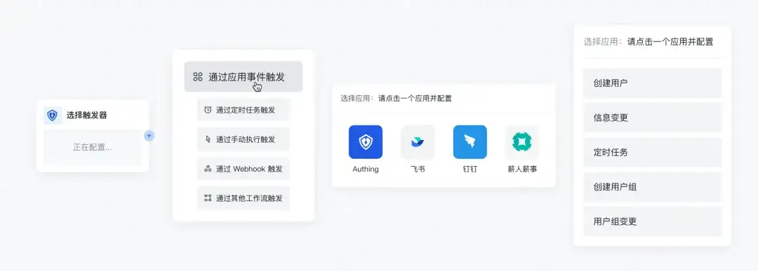 统一身份最终要落到治理上,而治理的核心就是生命周期自动化。员工从入职、调岗到离职,不同阶段需要自动赋权、授权、关账号;外包和合作伙伴也需要严格的有效期管理。只有把人事事件与身份和权限打通,企业才能在降低风险的同时减少大量手工操作,实现“安全与效率双提升”。在 Authing 身份自动化平台中,企业无需从零开始配置复杂流程,即可轻松完成身份数据的自动同步与权限编排。平台内置了数十种主流企业应用(如:钉钉、飞书、企业微信、Azure AD、北森等),覆盖了常见的上游 HR 系统与下游业务系统,完整支持员工入职、调岗、离职等各类身份变动场景的全流程管理。所有节点均已预设好数据映射逻辑、身份字段转换规则和触发条件。流程支持可视化拖拽编辑,支持定时/实时触发、条件判断、数据清洗与分发,帮助企业像“搭积木”一样构建高度自定义的身份自动化编排系统。