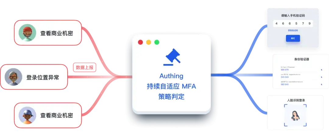 统一认证并不是“登录一次”这么简单,它包含单点登录、MFA、多因素策略和动态风险识别等丰富能力。企业需要确保用户在不同场景、不同网络环境中,都能被准确、安全地认证,同时保持良好的登录体验。只有认证体系标准化了,后续的权限和审计才有可信的上下文可依赖。Authing 在单点登录、MFA、风险识别与访问策略方面提供了完整的产品能力。Authing 通过集成 AI 和机器学习算法,能够从用户的行为数据中识别潜在威胁,实时监测并评估用户风险。当系统从断层登录检测到用户时,或尝试访问其平时不常接触的的敏感资源时,AI 会标记这些异常行为并触发相应的安全响应步骤,如动态增加认证要求。基于 AI 的分析能够在短时间内完成风险评估,自动决定是否进行额外的验证步骤,确保对异常活动的快速反应。