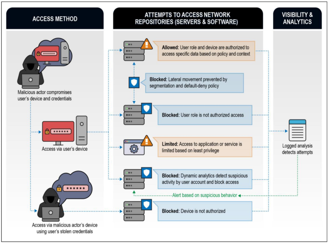 在一个零信任网络中,失陷的用户的证书和设备被默认为是恶意的,除非被证明清白;并且网络是分段的,从而限制了枚举和横向移动的机会。尽管恶意行为体可以同时作为用户和设备进行身份验证,但对数据的访问将受到基于安全策略、用户角色、用户和设备属性的限制。