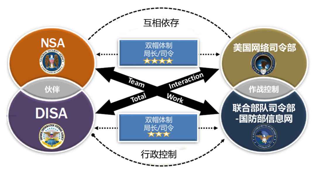 图 1:美国国防部内四大网络空间作战机构之间的“双帽”关系