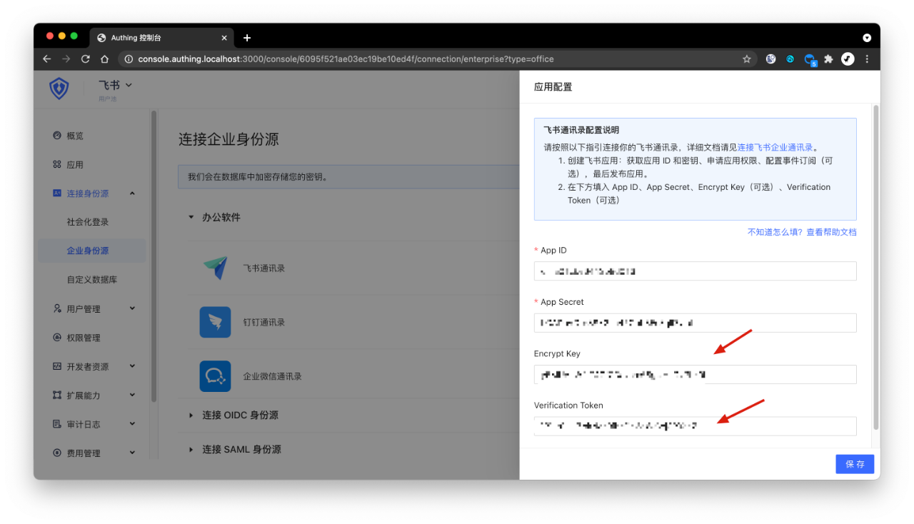 1. 在 Authing 中配置飞书通讯录,并按要求填入以下信息。