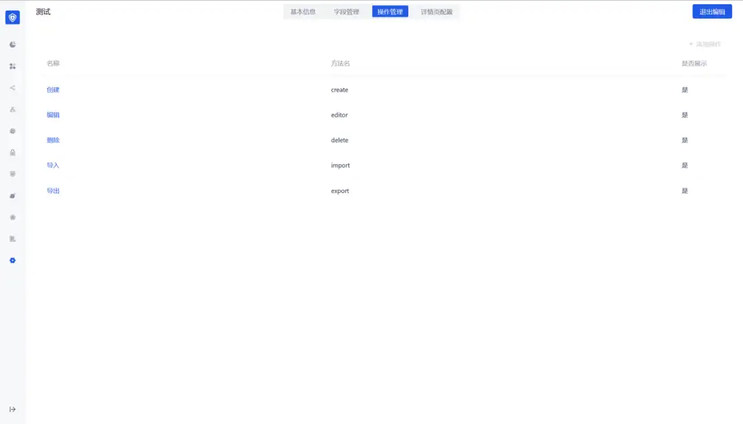 可以配置功能的操作。默认提供创建、编辑、删除、导入、导出。