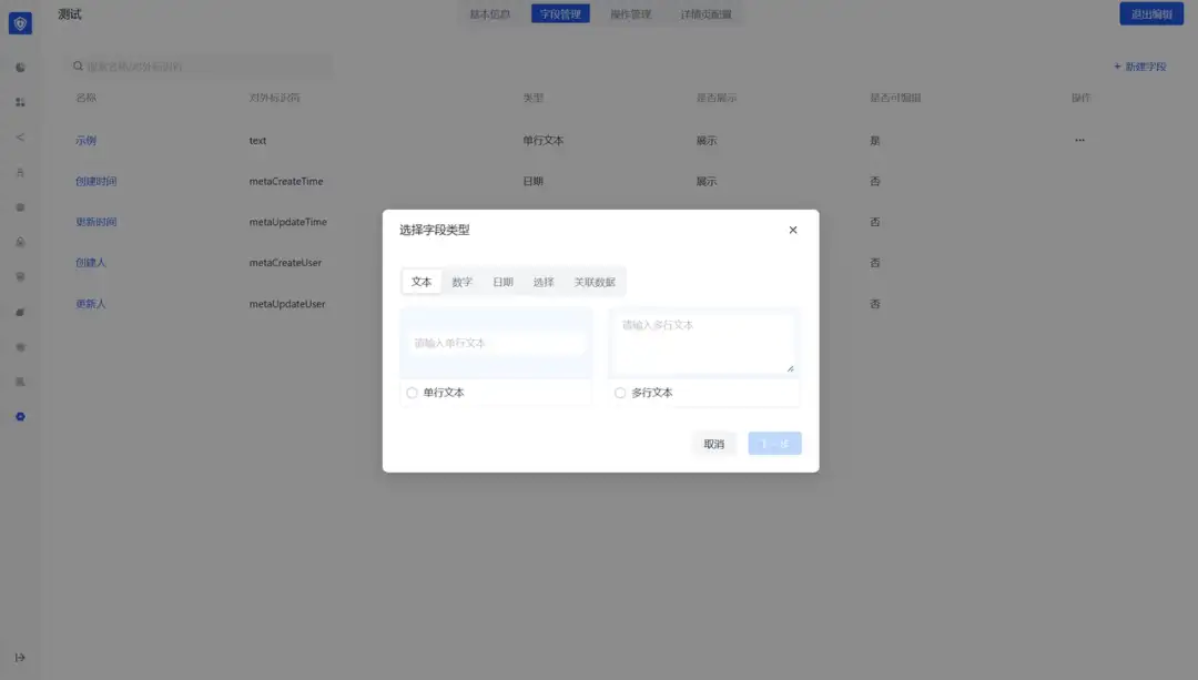 数据对象的字段类型支持常见的文本(单行文本、多行文本)、数字、日期、选择(布尔值、枚举值)、关联数据类型。