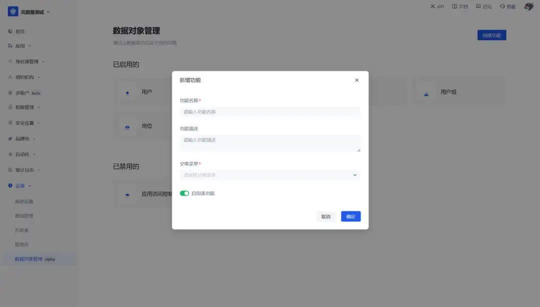 用户可以通过创建功能,新创建数据对象,并可自定义配置数据对象的基本信息。