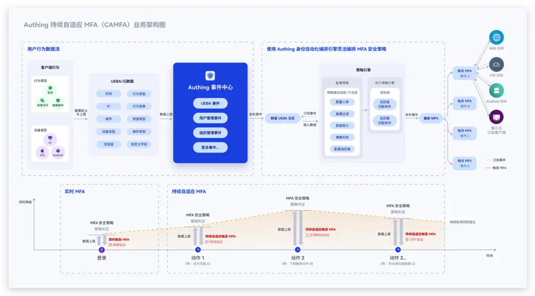 Authing 身份云基于 Adaptive MFA 的基础,增加了持续性的校验检验机制,在用户使用产品的生命周期中,可以持续进行校验。通过对用户行为的分析与用户使用环境分析,实时动态持续评估当前风险,一旦触发风险机制,则实时唤起 MFA 认证,马上对用户当下状态进行阻断,从而提高账号安全。